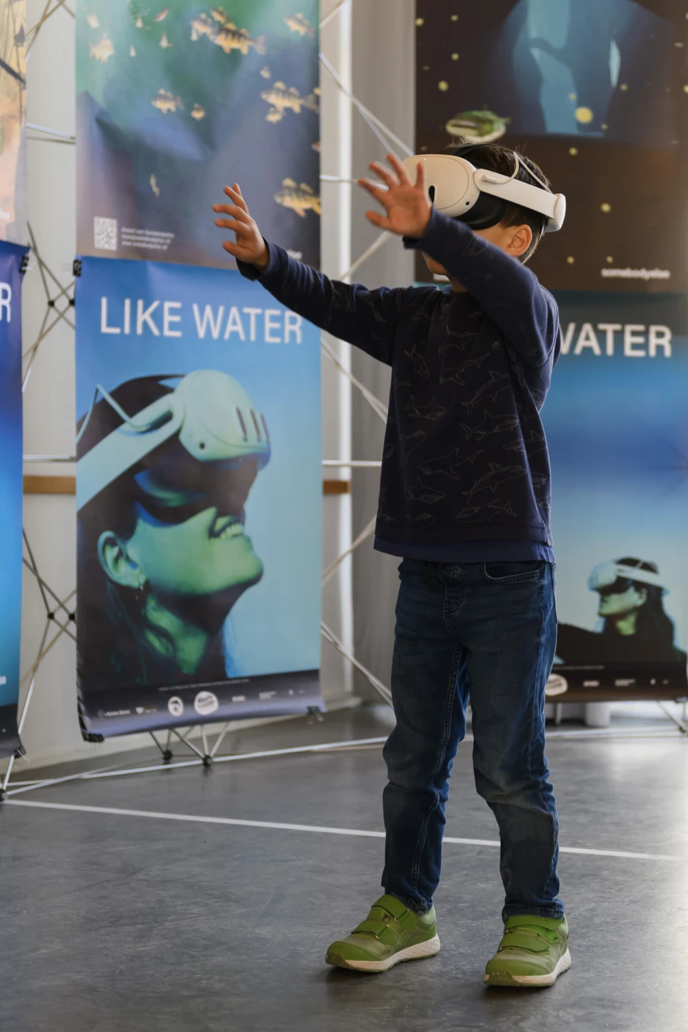 In einem interaktiven Virtual Reality Erlebnis werden die Besuchenden durch unterschiedliche Gewässerwelten geführt. In den immersiven Welten wird Wissen zum Wasser vermittelt und das Bewusstsein für die Bedeutung von Wasserressourcen geschärft.